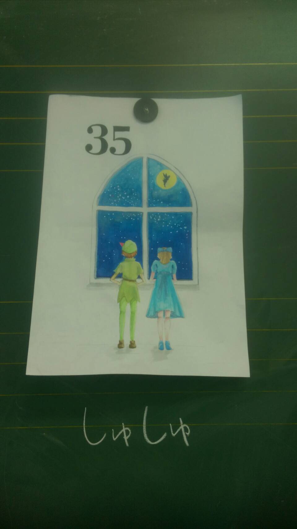 水彩画の力作......窓と後ろ姿のピーターパンとウェンディが美しいですね......
