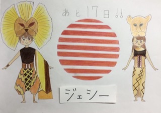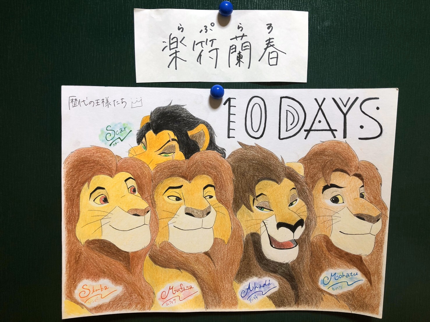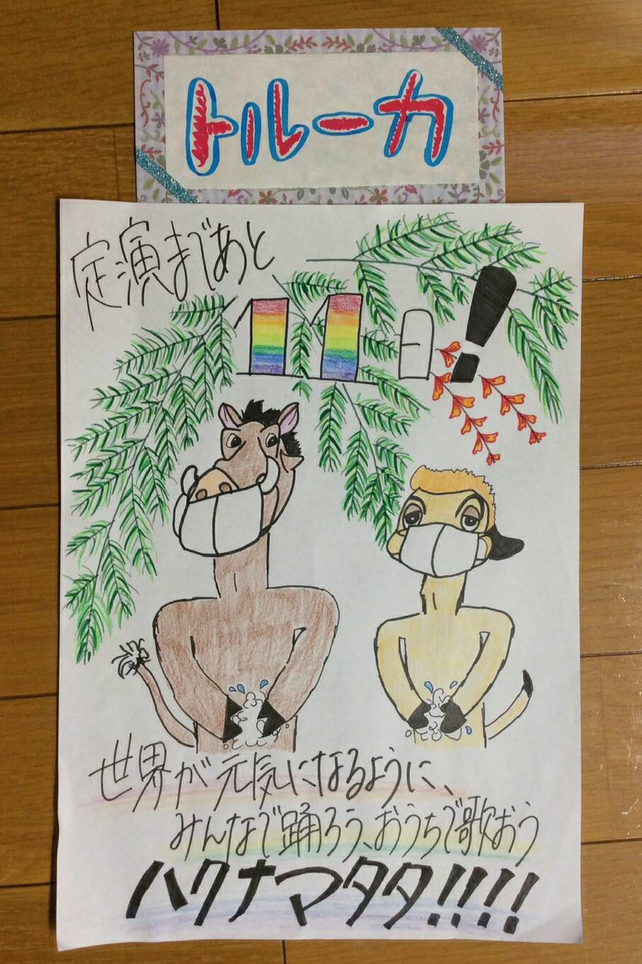描いてくれたのはトルーカ。2部劇ではプンバァ役です!相棒のティモンとコロナ予防してます。