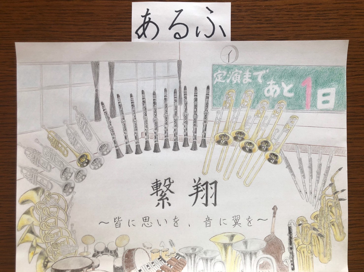 各パート人数分の楽器が描かれていますね、きっと大変だったはず!力作ですね、音楽室で合奏している気分になれます!時間も13:30なので開演時間を意識しているんでしょうか?
